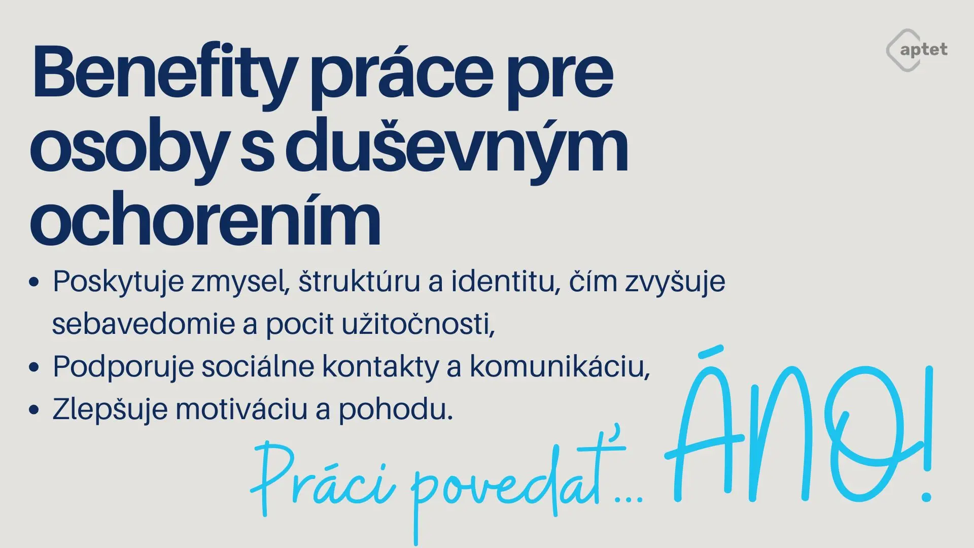 - Reálna šanca na otvorený pracovný trh: podpora (job coach, tréning na mieste, úprava pracoviska) umožní uspieť aj ľuďom, ktorí by sa bez nej k práci nedostali.